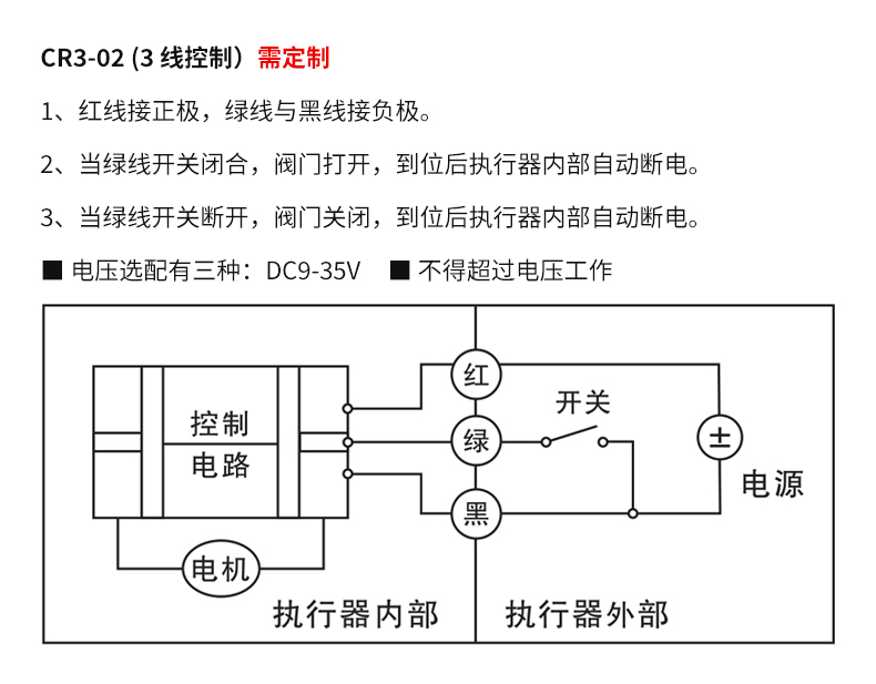 2、當(dāng)綠線開關(guān)閉合,閥門關(guān)閉,到位后執(zhí)行器內(nèi)部自動斷電。