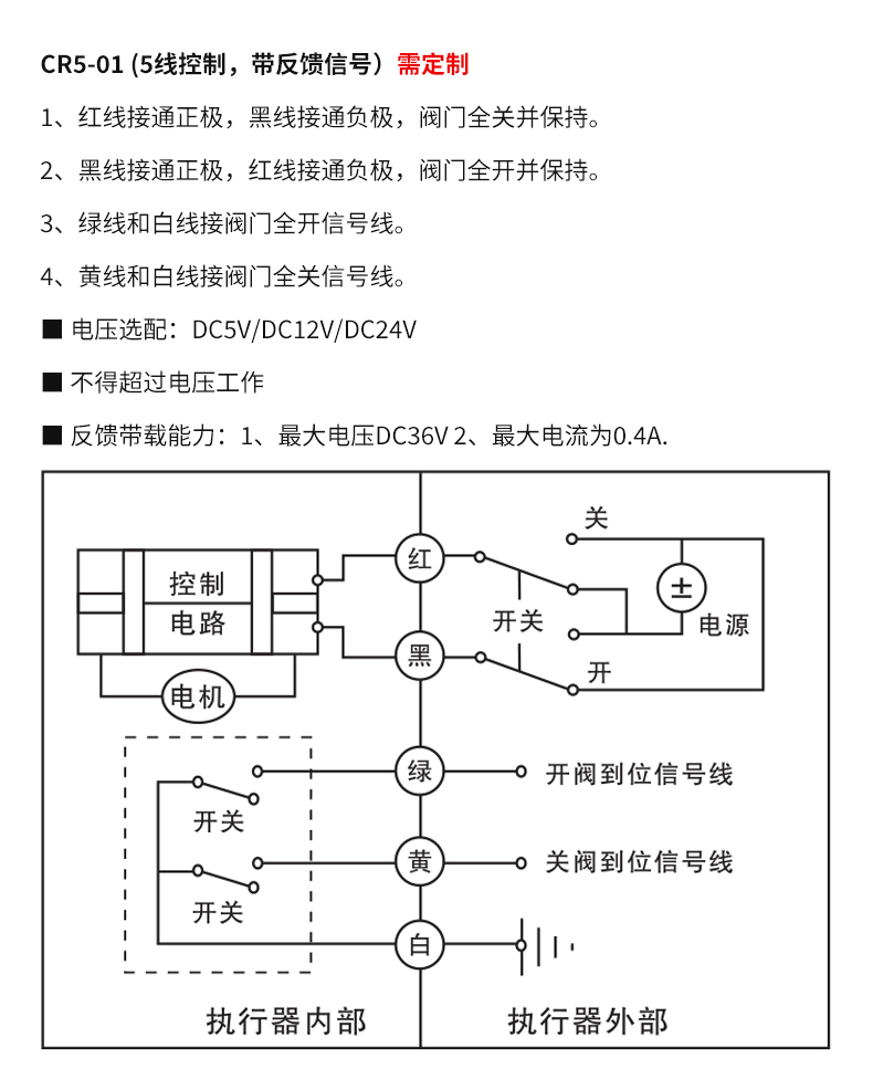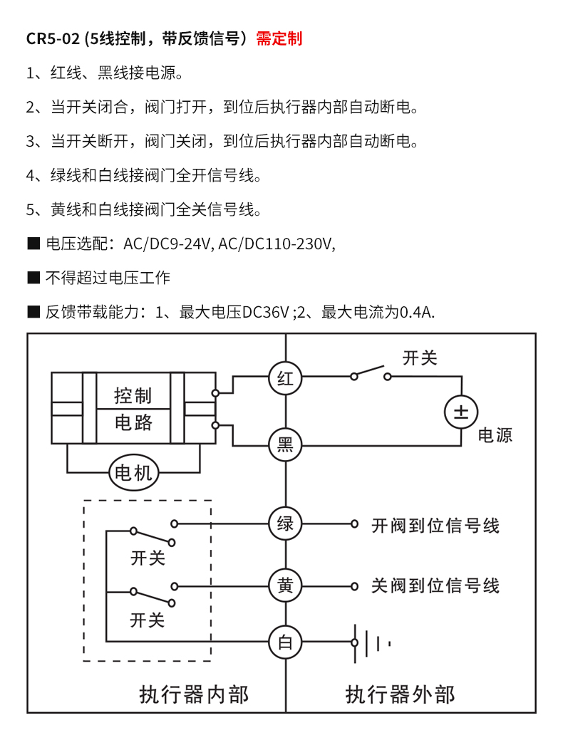 2、開關(guān)與紅線接通,閥門打開,到位后執(zhí)行器內(nèi)部自動斷電。