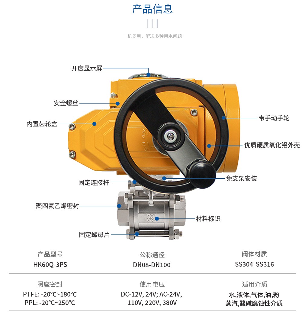 使用范圍:防爆型電動三片式球閥鑄造采用德國引進的先進工藝,閥座采用彈性密封結(jié)構(gòu),密封可靠,啟閉輕松。閥桿采用有倒密封的下裝式結(jié)構(gòu),閥腔異常升壓時,閥桿不會被沖出。選用不同的材質(zhì),可分別適用于水、燃氣、蒸汽、油品、硝酸、醋酸等多種介質(zhì)。
